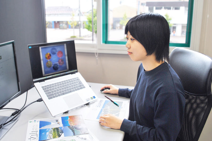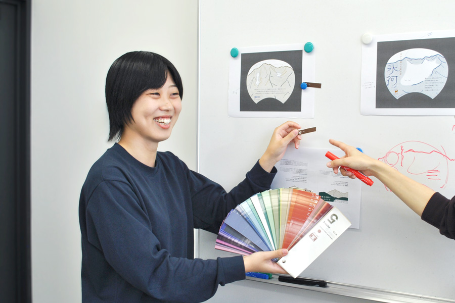 上司や先輩社員の方にデザインを見ていただき、修正点やこのあとの進め方について確認します。自分にはない引き出しを聞く機会でもあり、貴重で楽しいです。